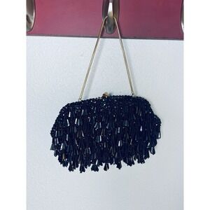 Vtg Black Beaded Sequin Evening Bag Purse Hong Kong Kiss Lock On Trend Classic