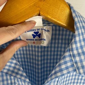 Classic vintage Girl Guides of Canada uniform shirt in blue and white gingham.