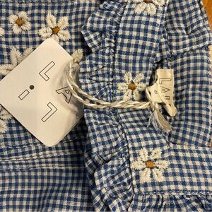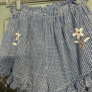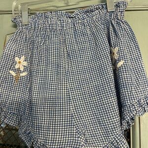 Blossom set -Blue gingham two piece set is just darling. Top has square neck with embroidered flowers and ruffle around neckline. Button down back. Shorts have ruffle waist and bottoms with two beautifully embroidered flowers on front and back of shorts.
