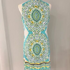 Chic sleeveless mini dress with vibrant mandala pattern. Aqua and yellow hues create a lively look. Perfect for warm days.