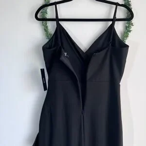Description: Frilly ruffles trim the tulip-style hem of a figure-skimming little black dress fashioned with slim, adjustable shoulder straps for a perfect fit.