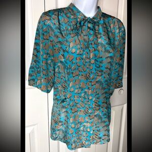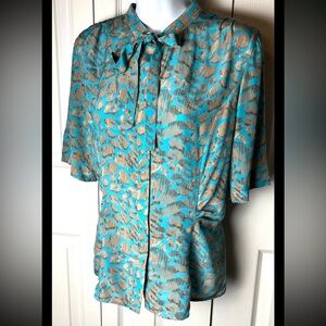 DONCASTER Silk Blouse Tie Collar Button Turquoise Brown Short Sleeve Geo Small