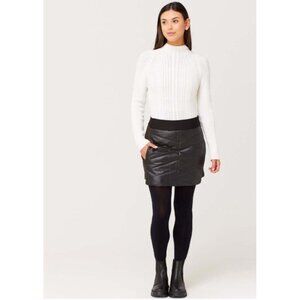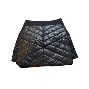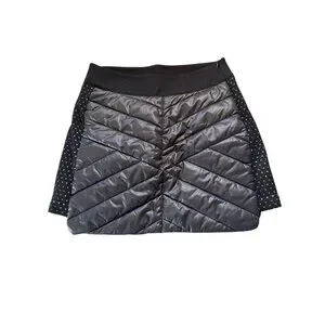 Slimming and flirty. This quilted mini skirt is easy to slip on over leggings for a cute apres look or wear with your favorite tights and boots. Embroidered floral side panel on black and bordeaux, knit side panel on chevron and nordic skirts.