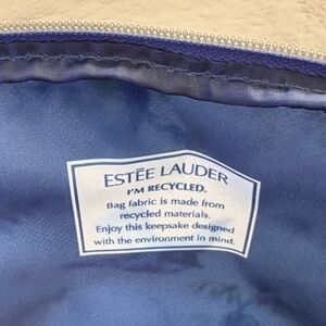Stylish Estee Lauder bag in a soothing blue shade. Ideal for organizing essentials. Made from recycled materials.