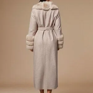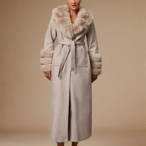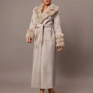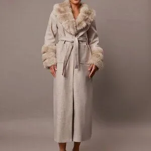 Khaki Elegant Womens Warm faux Fur trimmed belted Jacket Coat