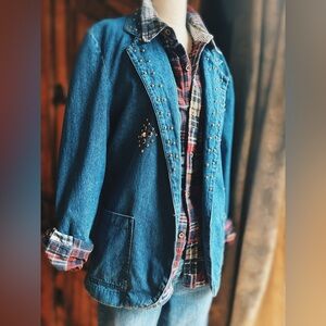 Vintage denim blazer with details of gold tone studs , studs with topaz, red, pearl and Safire blue. Purposeful Raw hem on the cuffs. Size : M 21” pit to pit Shoulder to hem 29” L Sleeve length drop shoulder 20” L Blazer only this listing. Necklace and jeans listed separately.. flannel not fir sale
