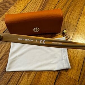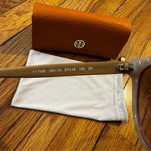Stylish Tory Burch sunglasses with a beige frame. Gold details add elegance. Perfect for any look.