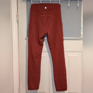 Beautiful Lululemon high-rise leggings in a rich red/rust tone with convenient side pockets. Flattering fit that’s perfect for workouts, yoga, running errands, or everyday athleisure wear.
