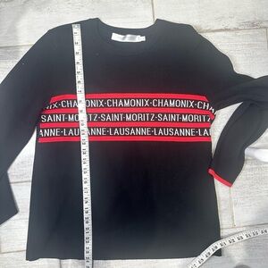 Chic and sporty black sweatshirt featuring bold red and white woven text design with the names of famous alpine destinations: Chamonix, Saint-Moritz, and Lausanne. Cozy and stylish, perfect for casual wear or après-ski vibes!
