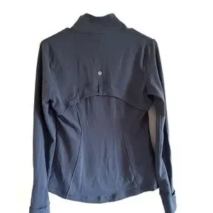 Lululemon Define Cropped Jacket in Deep Slate Blue featuring front zipper closure, long sleeves, thumb holes, fitted, front pockets.
