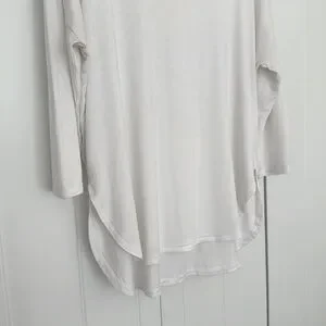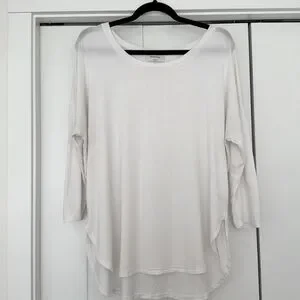 A closet staple! White 3/4 length sleeve top is perfect for any occasion. Rounded hem and comfort neckline makes it a simple yet stylish design and a versatile addition to your wardrobe. Enjoy comfort and style with this must-have piece. Gently worn