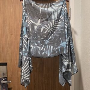 Elegant shawl featuring a tropical leaf design in gray and blue. Ideal for adding a stylish touch.