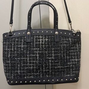Excellent condition. Clean. Such a beautiful bag. Stylish tweed shoulder bag. Features a chic fur pom and stud accents. Perfect for any occasion.