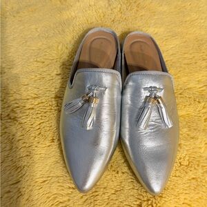 Elegant silver mules with tassel accents. Perfect for stylish outings.