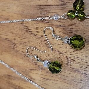 This elegant jewelry set sparkles and dances in the light and captures eyes everywhere it goes. Stunning olivine green with clear crystals suspended by sterling silver chain. Perfect for adding a touch of sophistication to any outfit. The set includes a necklace and matching earrings, crafted with attention to detail. In excellent like new condition. Please see the measurements in the photos.