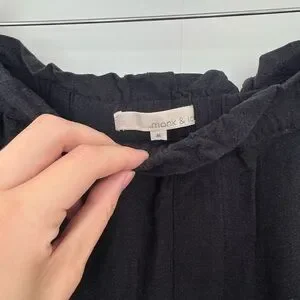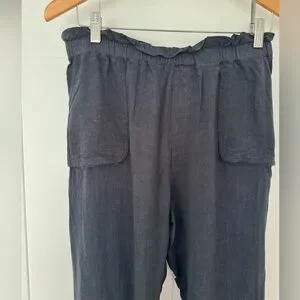Stylish linen-blend black wide-leg, straight pants. Super comfortable with elastic waist band. Square cargo-style pockets in the front and slit pockets in back.