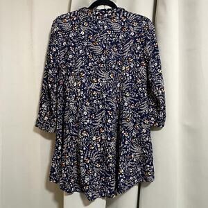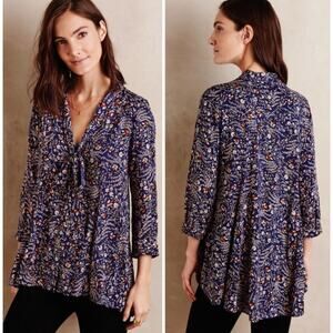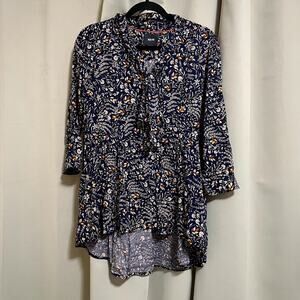 Anthropologie Maeve Floral Tie-Neck Swing Blouse - features a multicolor floral print on a deep navy blue background, a high-low style hemline, a button-down front, 3/4 sleeves and a versatile tie-neck detail. 100% Rayon, light weight.