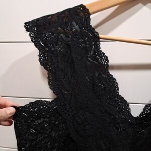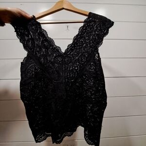 Elegant black lace v-neck sleeveless lingerie top with intricate detailing. Perfect transparent lace cami to achieve a goth, whimsigoth, dark fairy, dark coquette, grunge or Y2K aesthetic. It has a little bit of stretch. There are no size or fabric tags, the size is approximately Large or XL, based on measurements.