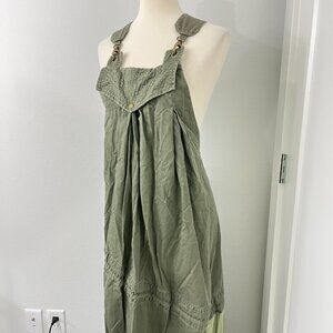 Features: This is a silk-cotton blend jumper. Wide, adjustable straps with metal buckles. Oversized silhouette with some pleating on the bodice and a tiered skirt. The style is loose and flowy, with wide straps that have chunky metal hardware for an adjustable fit. The bib-style bodice features a single button closure and soft pleating, which continues down into a relaxed, drop-waist skirt with subtle tiered seams. This piece combines comfort with a unique, rustic-boho aesthetic. Beautiful drape and feel.