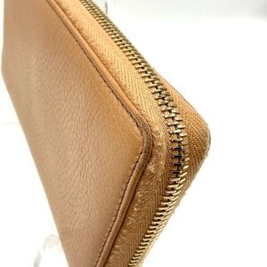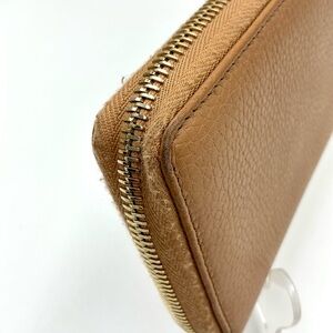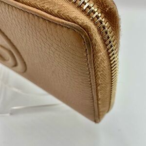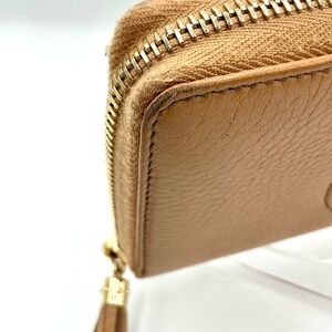Elegant Gucci wallet in rich tan leather. Features embossed logo and zip-around closure. Corners do show a little wear. Zipper pull has tassel. Interior has 12 card slots, area for bills and center coin compartment.
