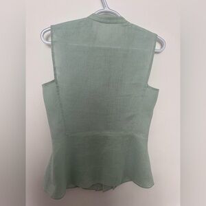 Elegant sleeveless top. Features pleated front made up of 100% silk. Button closure at neck. Rest of blouse is 100% linen. Perfect for casual or formal wear. Light blue/green colour
