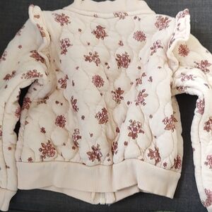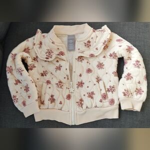 Elegant jacket with floral patterns and ruffled shoulders. Features a zip closure with a cute flower zipper. Soft cream fabric with pink and brown flowers. New never worn!! soft, quilty feeling