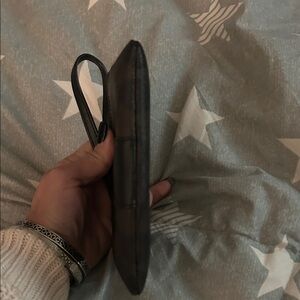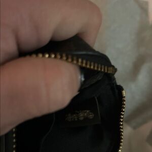 Elegant Coach wristlet with leather finish. Features a sleek wrist strap for easy carrying.