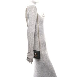 This is an authentic GUCCI Roxy Calfskin Medium Blondie Chain Wallet in Black. This shoulder bag is crafted of black textured calfskin leather. The bag features a matching chain-link shoulder strap and a matching Gucci GG logo on the crossover flap. The bag snaps open to a partitioned matching leather and fabric interior with card slots, patch pockets, and a zipper compartment.