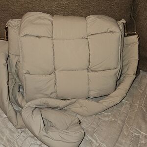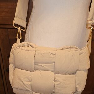 This stylish beige quilted shoulder/crossbody bag is perfect for any occasion. Its design and comfortable strap make it a must-have accessory.
