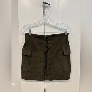 Elevate your style with this dark green mini skirt featuring a trendy lace-up design. Ideal for both casual and evening wear. 14” across waist 16” waist to hem.
