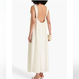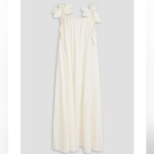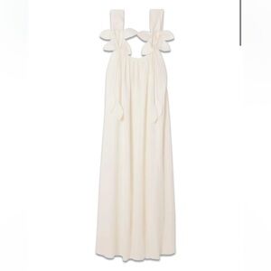 Elegant cream midi dress. Features white bow accents. Sleeveless design. Perfect for any occasion.