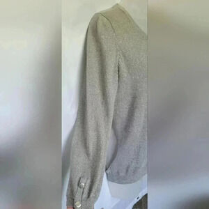 Add a touch of elegance to your wardrobe with this stunning Limited brand cardigan from The Limited brand. it is VT/ Y2K from the 1990s. The silver metallic shimmery, gray/silver pattern in front and sheer back make is perfect for any occasion. The tight-knit fabric is made of a combination of polyester, nylon, metallic, and cotton materials, ensuring both comfort and durability. The 3/4 sleeves and round neckline provide a stylish and modern look, while the metal button accents add a touch of sophistication. This slim-fit sweater is designed for women and is available in size medium, making it a perfect addition to any wardrobe.