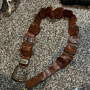 Stylish brown leather belt featuring turquoise accents. Unique design with metal buckle.bought at free people but not marked