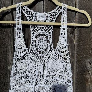 This lightweight, open-knit piece is perfect for festival season, beach days, or layering over a slip or swimsuit. Features intricate crochet patterns throughout with a racerback design and flowy silhouette for that effortless bohemian vibe.