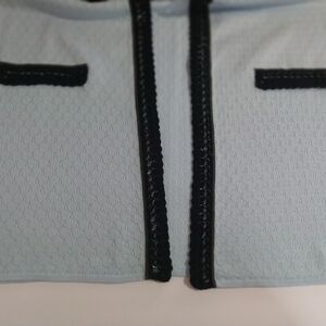 This elegant women's jacket features a sophisticated blue color with striking black trim. Perfect for adding a touch of class to any outfit.