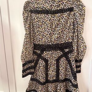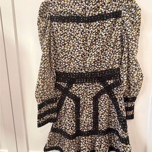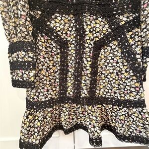 Chic long sleeve dress with intricate black crochet detailing. Perfect for stylish outings. Features high neck with loop/button enclosure and zipper. Fits more like a 0. Really upset I don’t fit this anymore, one of my favorite pieces.