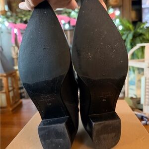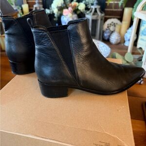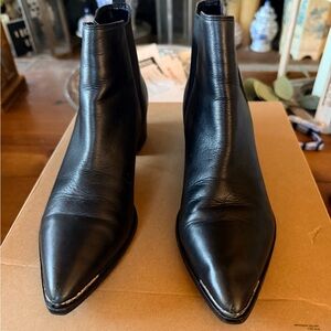 Step out in style with these sleek black leather ankle boots. Perfect for any occasion, these boots offer both comfort and elegance. Leather is so supple.. silver toe cap.. elastic slip on style. In great cond.. only worn a couple of times. Extremely comfortable.. can be dressed up or down.