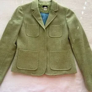 Stylish herringbone blazer by J. Crew. Features a classic design with front pockets. Ideal for professional or casual wear. Good used condition. Last pic shows a small flaw/hole on inner sleeve. Size 8.