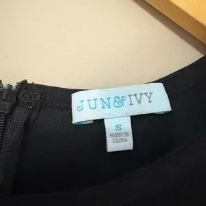 Keywords: Jun & Ivy, sleeveless dress, flared dress, knee-length, black dress, diamond pattern, casual dress, women's fashion, easy wear, versatile dress, machine washable, pre-owned dress, small size, zip closure, no-wrinkle fabric.