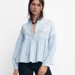 Zara Embroidered Light Blue Floral babydoll Blouse with balloon sleeves Size M