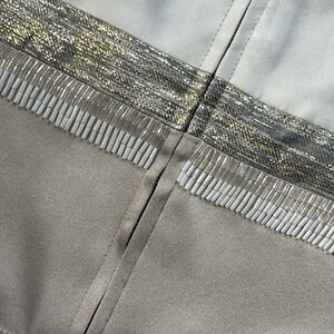 The St. John Women's Size 6 Limestone White Gold Hand Beaded Shimmer Silk Jacket is a luxury evening blazer perfect for special occasions like weddings, parties, christenings, and formal events. Made by St. John, this jacket features hand beading on silk fabric with a structured sateen texture, showcasing a colorblock pattern in beige and ivory tones. The long sleeve jacket is lined with 94% silk and 6% spandex, and care instructions recommend dry cleaning only. With a classic fit and zip closure, this one-piece jacket exudes a sense of sophistication and elegance, making it a standout piece for any occasion.