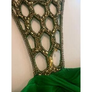 SCALA 100% SILK TOP SEQUINED BEADED NECK FLOOR LENGTH GREEN GOWN WOMENS SIZE 5