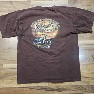 Authentic vintage Harley-Davidson T-shirt from Kauai, Hawaii. Men’s XL, single stitch, made in the USA. Brown cotton with chest pocket graphic and large back motorcycle print. Great vintage fade. No major flaws.