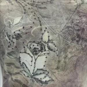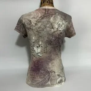 Apt. 9 short-sleeve top features a Y2K-inspired aesthetic with an all-over floral and scrollwork sublimation print in muted purple, gray, and cream tones. It includes distinctive rhinestone