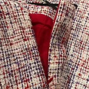 A tweed mini dress featuring a one-shoulder design, sweetheart neckline, single adjustable curb chain cami strap, leg cutout, and A-line silhouette. Side Zip