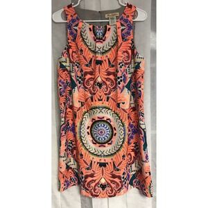 Mara Hoffman sleeveless shift dress showcases a vibrant, kaleidoscopic geometric print with intricate medallion motifs and desert-inspired accents. This eye-catching piece features a structured yet comfortable silhouette, fully lined for a smooth fit, and finished with a discreet back zipper closure. The bold color palette of neon orange, turquoise, and deep purple makes it a standout choice for summer events or resort wear. Pit to pit is 18.5" x 33" in length. Preowned in good condition.