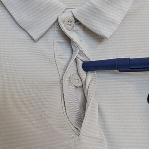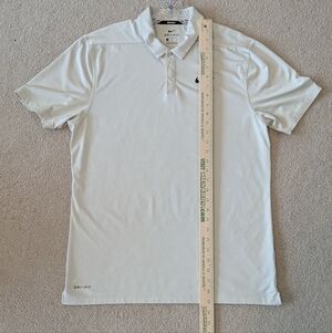 Nike Golf Polo, a 94% polyester moisture-wicking golf polo. Nike logo in black on chest. 2 button closure with "hidden" middle button (see photo). See photos for length and width measurements.