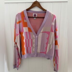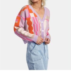 • RVCA cropped cardigan in a soft pastel colorblock design featuring lavender, pink, cream, and orange tones