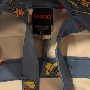 Chucky-themed overall shorts. There’s some minor pilling towards the bottom of the legs but other than that they’re gently worn and in good condition.