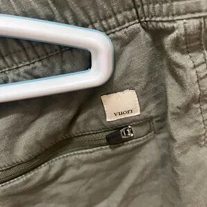 Green Vuori hiking shorts with regular front pockets, zipper front and back pockets. Hiking pant material. 3" inseam.